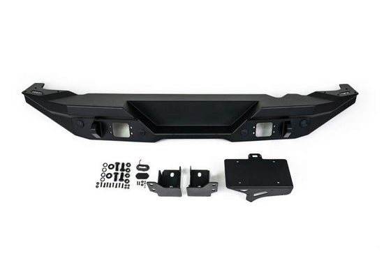 The FS-15 Series Bronco Rear Bumper was designed to maximize ground clearance and provide superior rear-end protection.. The license plate mount is located above the bumper and includes an LED plate light. Up to a 37-inch spare tire will fit above the bumper. Two 3-inch flush mount pod lights can be installed towards either side of the bumper. Two reinforced clevis mounts that take ?-inch D-ring shackles provide recovery options in case you get into trouble on the trail. This bumper is constructed of 3.5mm steel plating with 5mm steel supports, and then finished in a finely textured black powder coat to protect against rust.