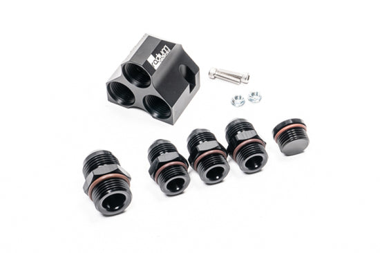 High flow distribution block designed to work with large -10AN and -12AN lines. Can combine three lines into one. Safe for use with alternative fuels. Fittings included.